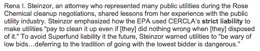 From 1983 to 1986 Martha C. Rose Chemicals received PCB contaminated equipment for recycling and disposal. After only four years of operating, and a number of EPA violations, the plant shut down. The EPA initiated cleanup of the site and removed 13.5 million pounds of PCB waste that was left behind. Contamination of nearby streams and soil increased the estimated cleanup cost to $35 million. Over 200 public utilities had sent PCB contaminated equipment to the plant and were deemed “potentially responsible parties (PRPs).” These PRPs were financially liable to foot the cleanup bill in accordance with the Superfund law “CERCLA.”